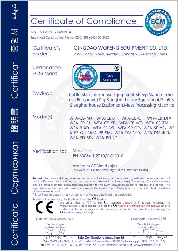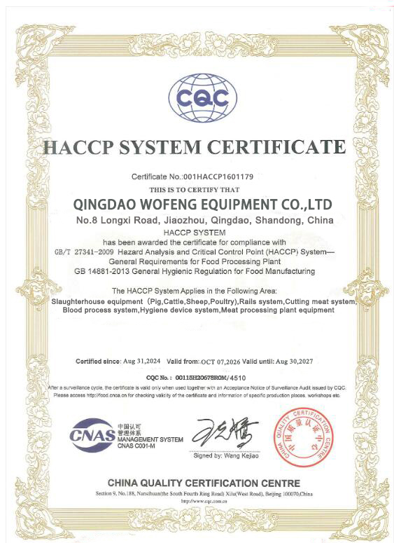 Qingdao Wofeng Equipment Co., Ltd (WFA Meat Processing Equipment), founded in 2009, specializes in R&D, production and sales of cattle, sheep, and pig slaughtering equipment. With years of industry experience, profound technical expertise and numerous national patents, it is committed to innovation and technical advancement to set an industry benchmark, delivering efficient, high-quality solutions for global clients.