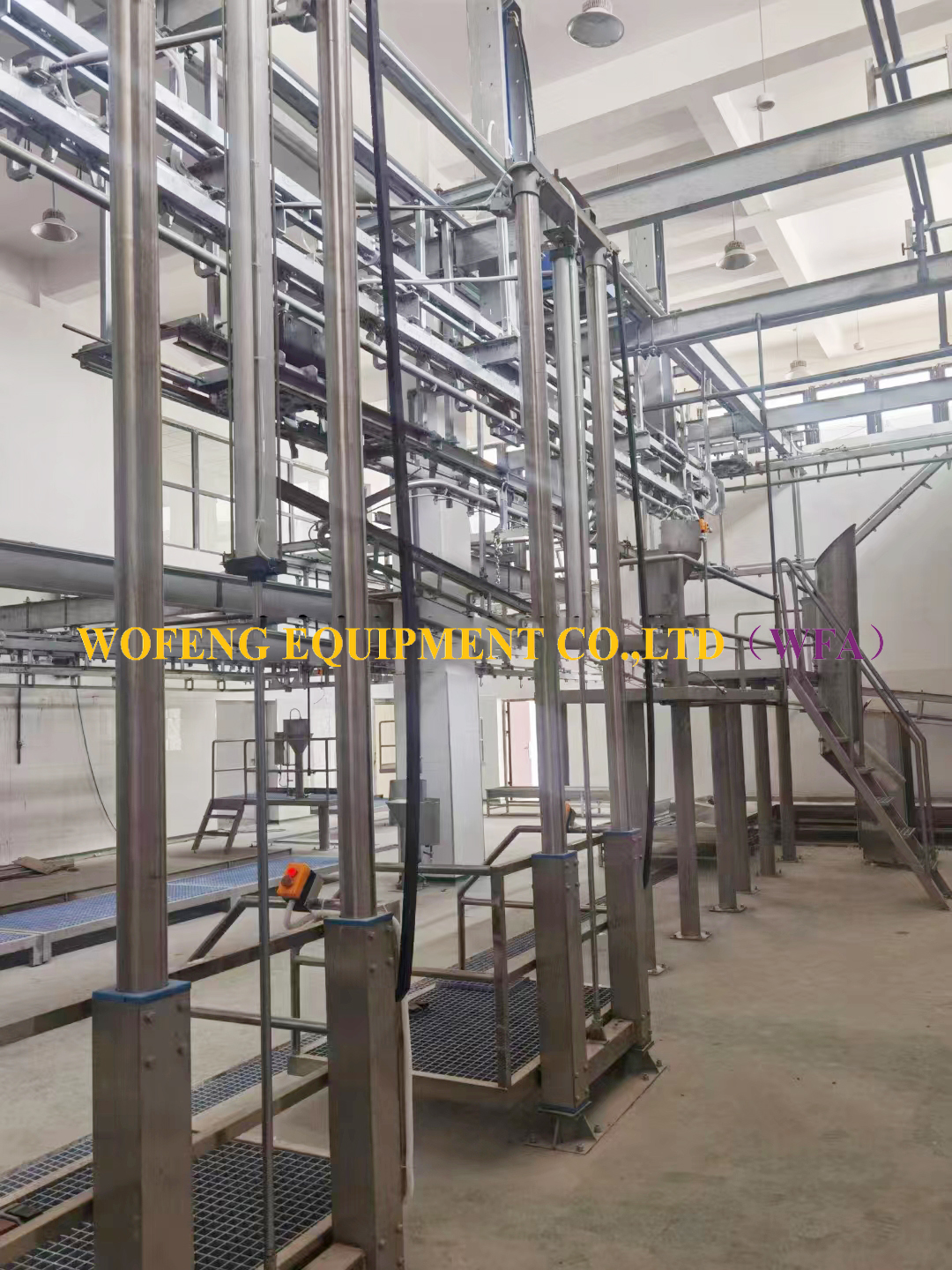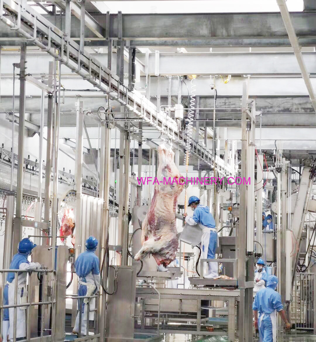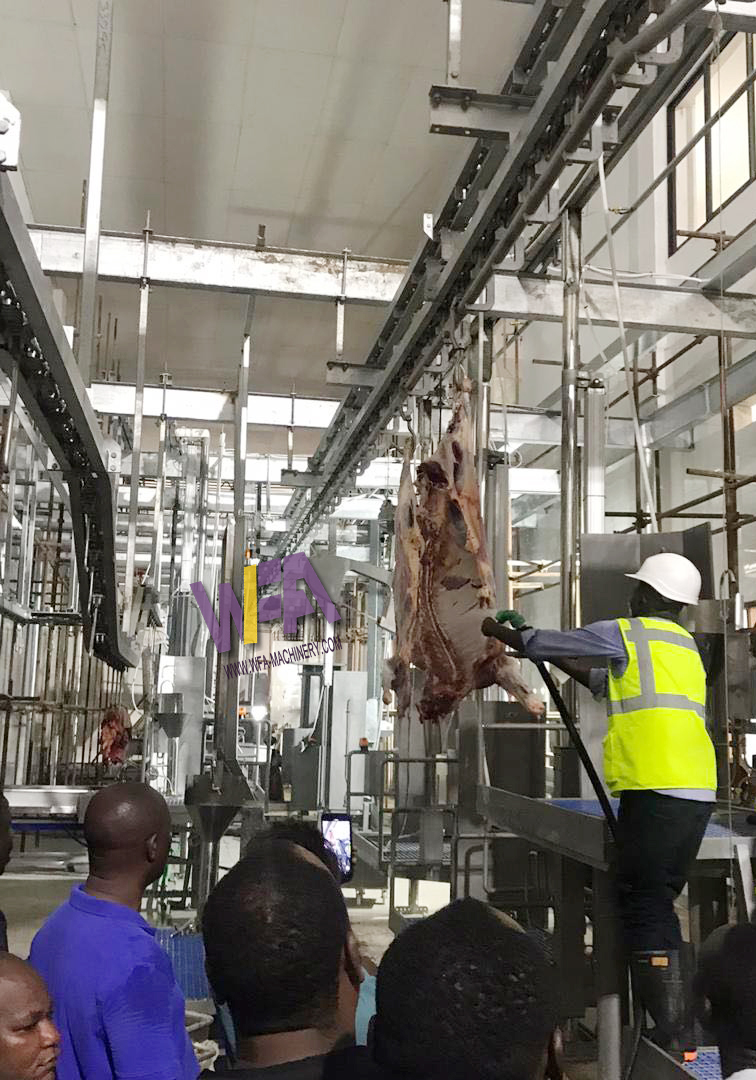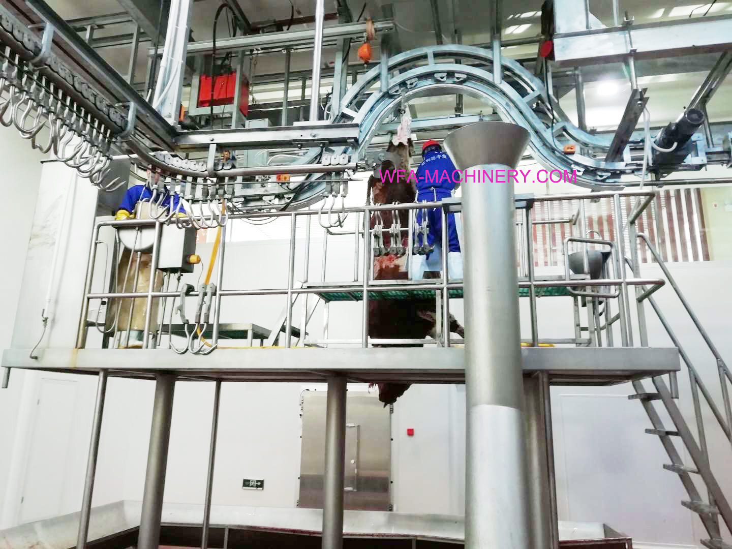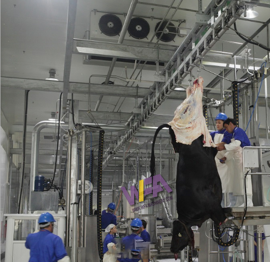 Application:The cattle dressing conveyor slaughterhouse requires conveyors that allow the movement of carcasses to each work station at the required speed or cadence by the production of the line.the separation between carcasses will determine the placement of the different jobs. The continuous movement must also be adapted to the customer's requirements. This is why the design of the chain is subject to the productivity, profitability of the line and the satisfaction of the operators.