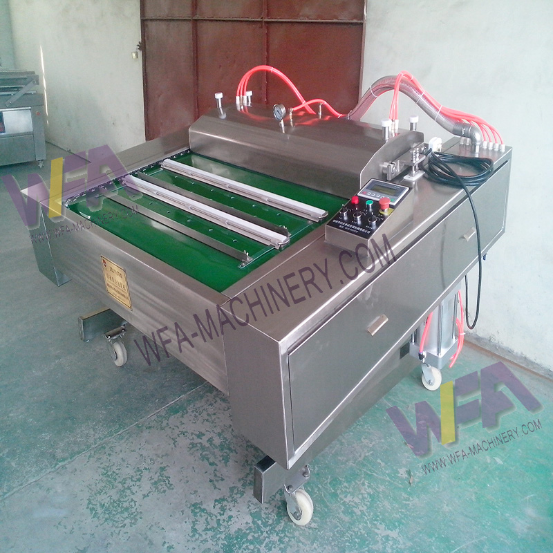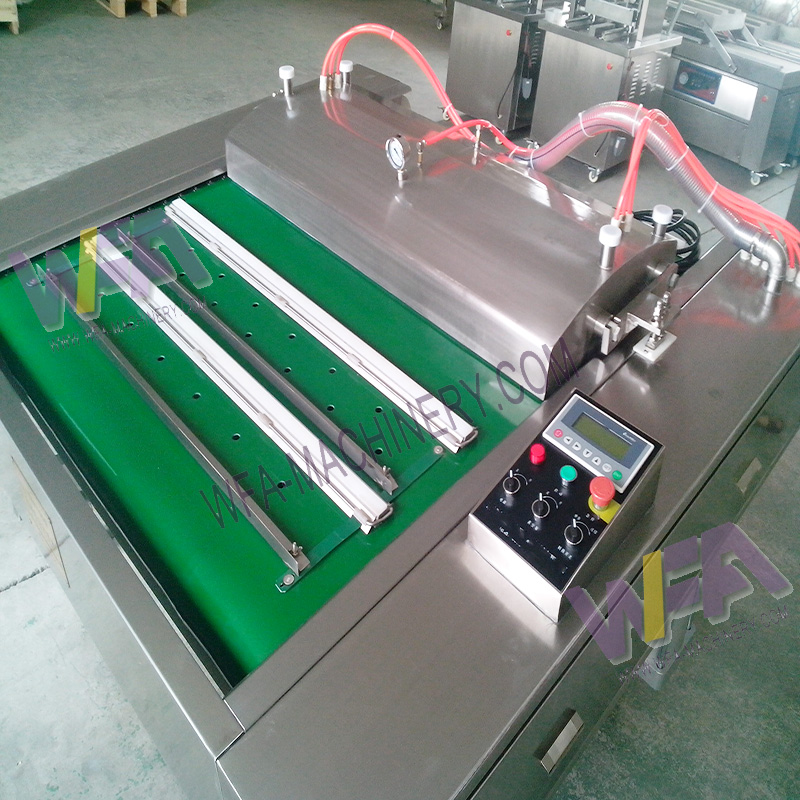 Application:The vacuum meat packing machine slaughterhouse conveyor belt type automatic vacuum packing machine is used for all kinds of products,available vacuum or raw food, cooked food, seafood, frozen product, vegetables, dried vegetables, fruits, edible mushrooms, medicine, electronic components, clothes and other vacuum products