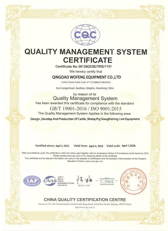 Qingdao Wofeng Equipment Co., Ltd (WFA Meat Processing Equipment), founded in 2009, specializes in R&D, production and sales of cattle, sheep, and pig slaughtering equipment. With years of industry experience, profound technical expertise and numerous national patents, it is committed to innovation and technical advancement to set an industry benchmark, delivering efficient, high-quality solutions for global clients.