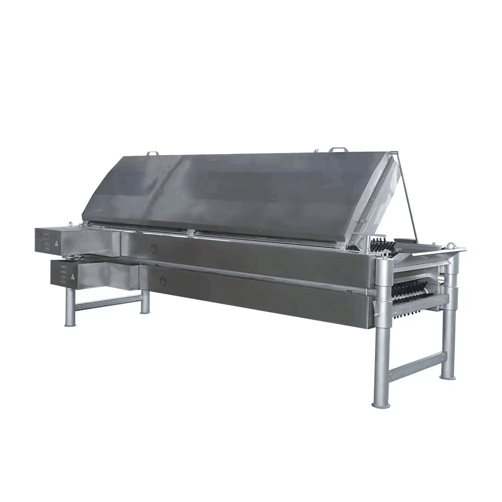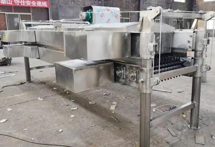 major equipment, using chain drive, so that two rows of upper and lower roller unhairing achieve relative rotation, thus taking off chicken feathers, feather removal roll up and down two rows of the distance can be adjusted to suit the different needs of chickens and ducks.
