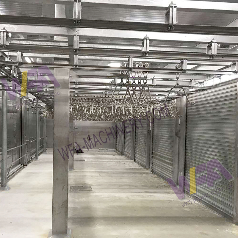 The pig carcass pre-chilling conveyor pig slaughter line for the pig carcasses are transported to the cold storage to chill the carcasses quickly,then transport the chilling room